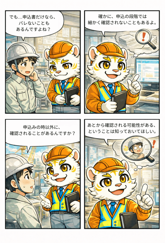 ぜねたある企業では内部告発により一斉摘発され、ました。資格に取消になった事例があるので、虚偽の申請はやめましょう。