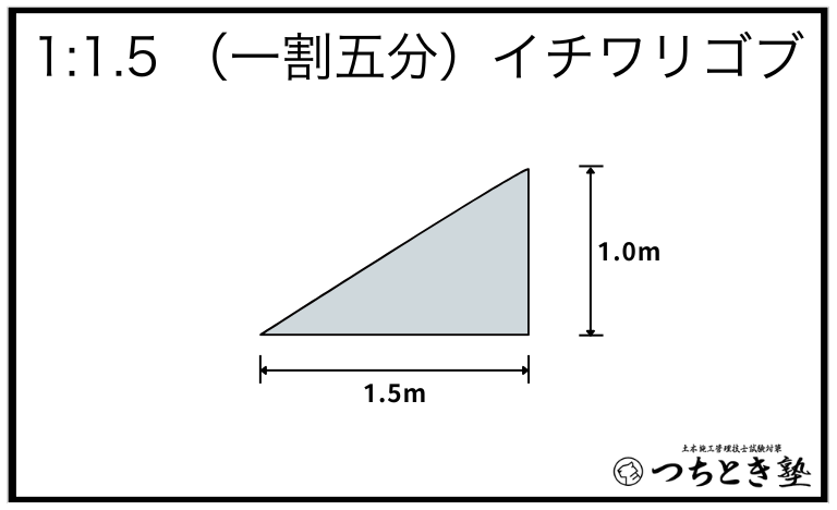 | 一割五分 (1:1.5) | 33°41′ 24″ | 66.66667% | 1 | 1.5 | 1.80278 |